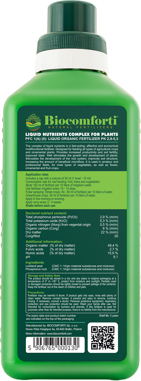 The complex of liquid nutrients is a fast-acting, effective and economical multifunctional fertilizer. Designed for feeding all types of agricultural crops and ornamental plants in open and protected ground.